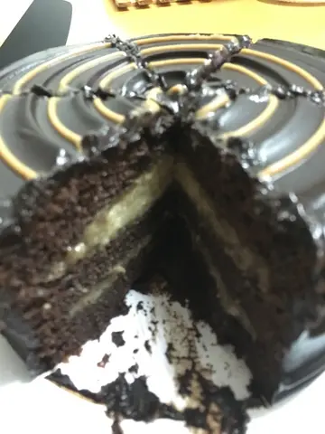 平日$398买一个,现在有两个,好滚动呀⋯⋯买的是两张券,可于指定日期前预约取货,不用一次食两个,那么过份,呵呵这公司买的蛋糕款不多,但全都是黑朱古力。今天收工就去取一个'焦糖香蕉朱古力蛋糕',回家跟家人品尝。型格的黑色蛋糕盒,可以选择配不同色的粗丝带,我拣选紫色。没太多花巧蛋糕,但有种平实简约的风格盒内底部放了纸碟,魔鬼叉(可选天使匙),金色蜡烛及蛋糕刀开刀了,切开看到香蕉茸夹心蛋糕湿润,不是干挣挣,不怕哽喉及食到一地蛋糕碎😂外表:平实简约香气:打开盒已闻到云尼拿及朱古力的香气味道:浓浓朱古浆及朱古力海锦蛋糕,双重朱古力享受,有淡淡黑朱古力的甘香,甜味适中。但吃不到焦糖味,香蕉茸在浓厚朱古力包围下,已不特出。价格:偏贵(6吋$398),但是次买一送一,所以有幸一试…查看更多