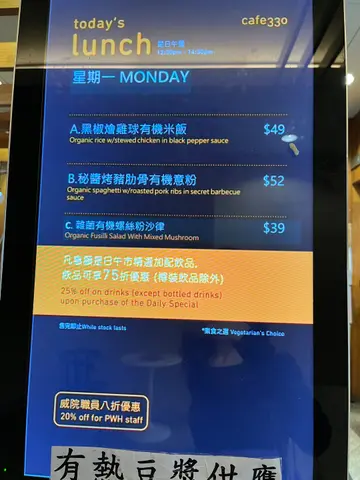 Cafe 330为新生精神康复会属下社会企业, 提供简约及健康的早餐、午餐、下午茶及晚餐。以令人心情愉快及健康的食物为主。选用有机蔬菜及其他有机食材, 新鲜冲调优质咖啡、健康小食及饮品。