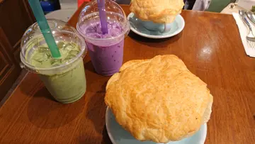 餐饮方面和朋友分别叫了冻紫薯牛奶和冻京都抹茶牛奶,味道都很浓,但多喝几口就开始饱肚了,所以除非很饿,否则会很浪费,因为下午茶的分量都很多呢!另外,下午茶可加$15要酥皮汤喔!