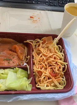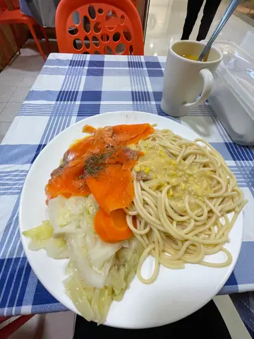 个汁麻麻地,个菜系菜头,个鸡排煎得几脆,上面有木鱼,呢个餐得鸡排系好食,有啲中伏。柠檬唔新鲜,中间和边边位变左色,佢自己都要批走啲皮,我知系小店,但可唔可以比啲诚意,其实我唔介意你比2块柠檬我,但唔好比块唔新鲜既我。另一个餐系蛋糕加沙律,盛惠$39,我见意粉咁大碟,个沙律应该都有返咁上下,所以我对呢个分量我有好大落差