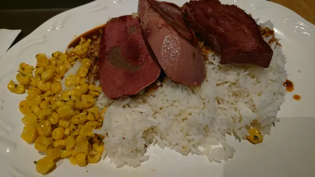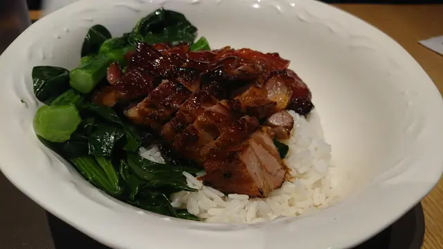 瀏覽完香港藝術館又累又餓,師姊請我吃午餐,Deli And Wine前身是半自助西餐廳,今天變身快餐廳。黑椒汁牛脷飯$65是我的至愛,三大片厚切牛脷,是整條牛脷的前、中、後部份各一片,所以口感都各有不同,前部份很爽滑甘香,後部份鬆化香酥,中部份又介於前和後部份的混合口感,一個字,正!粟米粒清甜,黑椒汁我只用淘飯吃,美味!師姊的大大碗叉燒飯$46,如假包換大大碗,碗是大大,飯量也是大大,叉燒量也多多,八分瘦二分肥又腍又滑,是最佳組合,還有幾條菜心,好正!查看更多