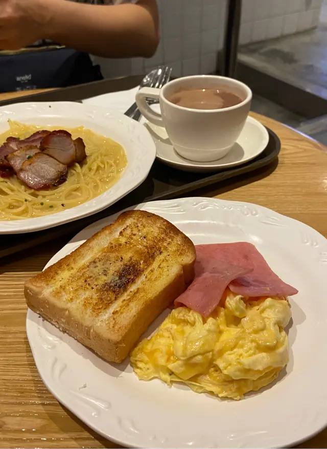 👁‍🗨Deli and Wine 📍尖沙咀梳士巴利道10號香港文化中心餐廳大樓地下----------------------無意中發現文化中心旁原來有間快餐店,餐廳店內光線充足,環境寬敞,座位非常多,晚飯時間人流較多牆上掛上餐牌,有各種輕食及粉麵飯,選好菜式後就可以到門口旁的收銀處,付款後等叫號,自己到前台取餐⚑ Daily Set 常餐 $58➰ 叉燒湯意粉·炒滑蛋·火腿·牛油多士常餐份量十足,牛油多士烘至微焦香口,1片大火腿開2,滑蛋大大份口感嫩滑,叉燒足足有4片,厚度適中,而意粉幼身偏腍,湯底偏淡,但整體不錯➰ 熱朱古力 <附送餐飲>份量適中,朱古力味濃郁,甜度正常💬 簡餐質素高,價格合理,環境舒適,食物款式多,性價比高,比起各連鎖快餐店,我更推薦這間餐廳👍🏻•查看更多