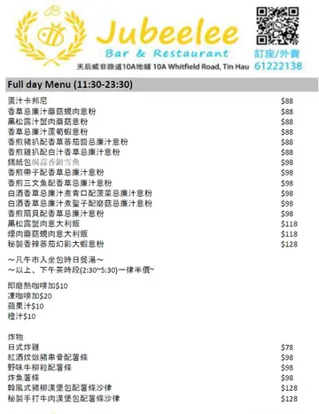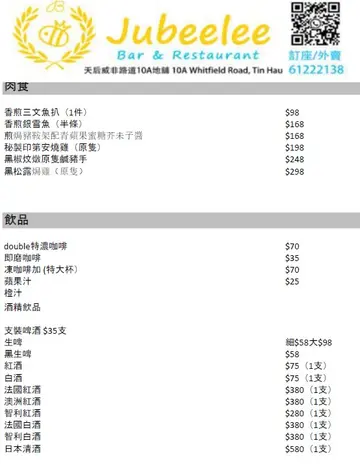 Jubeelee Bar & Restaurant (天后) 网上订位即赚Rice Dollars 网址: https://s.openrice.com/QrLS0DkmB00 地址: 香港天后威非路道10A號海都洋樓地下2號舖 电话: +852 61222138