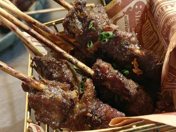 烧鸡肾,烧鸡翼尖,烧特制牛肉串,烧汁风琴豆腐