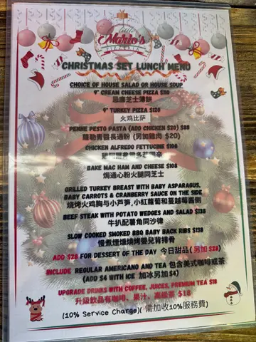 今日lunch time撑枱脚试吓呢间Little Mario ‘s Pizzeria,叫咗两个set lunch,前菜一个要薯仔沙律,一个要咗罗宋汤,个汤都几好,main course 就叫咗一个all day breakfast pizza,佢原来真系将成份早餐摆咗响个Pizza上面😂有鸡蛋,烟肉,蘑菇🍄蕃茄仔🍅味道都算正常。另外叫咗一个橄榄意粉,意粉嘅质地系几好嘅,但实在太油了😖食完成咀油,餐饮就加钱叫咗一杯Cappuccino同埋Hot Mocha☕️ ,最正常就真系尼两杯咖啡了,埋单$244,葵涌区午餐繁忙时间算系咁啦,虽然味道普普通通,但系服务都几好嘅,餐厅侍应全部都系菲律宾籍,要用英语沟通