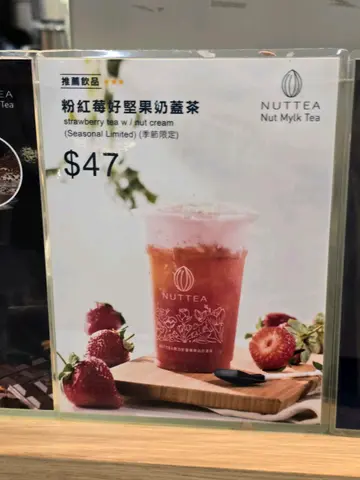 喺Nuttea铜锣湾时代分店Order咗三杯王牌四季春开心果奶盖茶,去冰 ,走甜好好饮,而且奶盖可以另上👍🏻👍🏻😊奶盖嘅味道好香浓,好滑士多啤梨茶草莓坚果奶盖,香甜嘅士多啤梨味再配合奶盖,甜而不腻,正正😊👍🏻相隔咗一段时间冇饮 饮品质素依然keep住水平而且很营养,和市面上的奶茶有所不同!它由五种坚果:腰果、核桃、杏仁、榛果、夏威夷果仁低温萃取而成