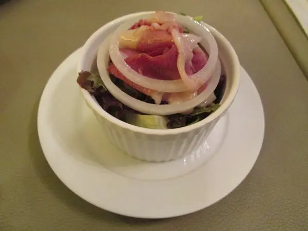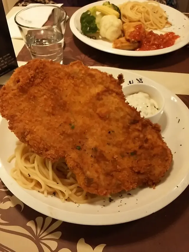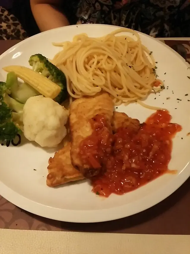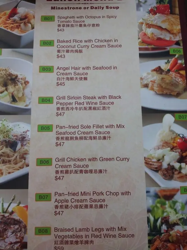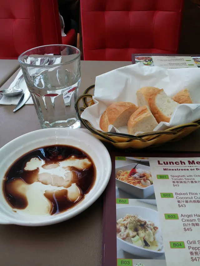 Surprisingly not too many dining here for lunch. I write that because across the corridor, the competing restaurant has cheaper lunch specials only for students. The appetizers came with a generous amount of oil and vinegar dip. More generous on the vinegar, though. The bread was slightly tough, but not too tough; nor was it crispy. So, borderline on the bread. The vinegar was mediocre quality; and the oil was of a reasonable standard. The cream of cauliflower soup was a pleasant surprise, though. It was rich and flavorful, without being too salty. When queried, the waitress hesitantly recommended this (both English and Cantonese interrogation). Odd. The entree was spaghetti with meat sauce. The fact that it was baked was a plus. And the baking seemed to make for a better rounder flavor. Of course it was still necessary to mix it, and I do miss having extra powdered cheese as a condiment, but for the price of the meal, complaints are unwarranted. The taste was as expected: Bold and straightforward; and I am grateful that no surprises were here. Now to the tea. Despite my request (in Cantonese) it be served without ice, it was brought with ice. Marks not accrued for that. It was served with a useless plastic stick. Luckly, I was able to improvise with some cutlery to squeeze the lemon slices. However, this did nothing for the taste of the tea. In fact, it may have made it worse There was some strange after-taste now. Not revolting, but still strange enough to season each sip with suspicion. Not a deal breaker, but I certainly will not dare to have ice tea here again. …查看更多