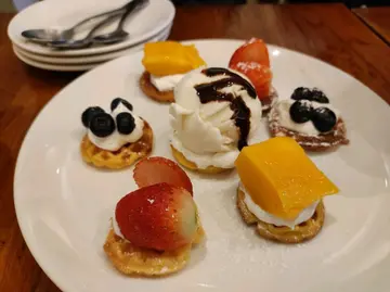 22.12.2021 星期三Rainbow Cafe一心想去「三:三」,竟扑空;再转到「是蛋」,又碰上放假,真的很失望;惟有转到码头附近「Rainbow Cafe」食过简单午餐,留肚吃甜品。从前觉得这里装修得不错,但时间一久,变得很陈旧,不再有惊喜;只能说地点很方便,近码头。午餐:A1全日早餐牛油吐司、迷你窝夫,牛奶炒蛋,香肠,猪柳汉堡扒,牛油粟米粒前一日吃过No.11,既精致又好吃;今天一作比较,这个餐卖相平平又不好吃。吐司不是吐司,只能说面包微微烘过。窝夫、汉堡扒、粟米粒还可,牛奶炒蛋无奶味或蛋味;香肠不热,实在不值$88,只能够勉强裹腹。加$10有杯热Mocha,整个餐最好就是这杯Mocha,拉花漂亮,饮起来不错。烟肉牛肉汉堡包配薯条、冻百香果茶家人吃,汉堡包大大份;薯条不脆不热。热蜂蜜姜茶家人饮,还可。如果有兴趣,可以坐户外座位,喝杯咖啡看看海还可。…查看更多