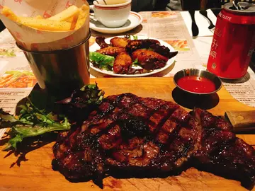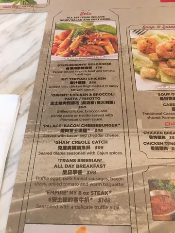 我们点了芝士鸡肉西兰花意大利饭套餐,包汤或沙律,及汽水,美国肉眼(10安士)。另外平日18:00-20:30惠顾任何一款主菜可享优惠,我们选了$0享用香烤鸡翼。先来的是美国肉眼,我们要5成熟,刚刚好,肉质鲜嫩,不过要快点吃,冷了就差一点点,另外配的厚切薯条,炸得很香脆,好吃。意大利饭的鸡肉味道很淡,好像没有调味,饭煮的不错,有咬口。免费的鸡翼就正常吧,没有特别。另外侍应主动说只要下载app做会员,就可以有单点食物9折优惠,刚好我们单点了美国肉眼,所以马上下载。要注意这里的营业时间,12:00-14:00 & 18:00-20:30。我们来的那天只有几3,4枱桌子的客人,所以坐得很舒服。…查看更多