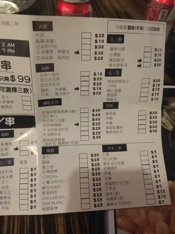 与姐妹们一起来到这间餐厅试一试最近新推出的串烧。有特价串烧 $68 / 10串选择,有优惠,正🤤大增意欲叫多些。我们叫有👍🏻评的牛柳,又叫火鸡肾臀,烧生虾,烧海螺片,大多春鱼等等。抵食推介都是$9 /串,价钱亲民。而且种类都颇多选择。有很多种类都是我喜欢吃的,例如猪颈肉,牛柳,鸡脾菇,秋葵和烧金针菇等等。另外, 我们还叫了其他小吃。牛油蒜蓉翡翠螺,蒜香,惹味,肉质弹牙,肥美肉厚。鸡翼,脆皮,美味。牛油粟米粒,热辣辣,又香又甜。