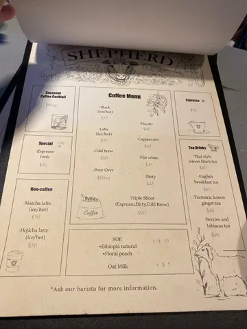 🌟中上环出左名多cafe同bar,今日带左个中意咖啡既朋友去chill下,relax下,顺便打下卡甘。今次我地黎到上环巴甸街附近一间小店,去拜访一下好特别既coffee cocktail,顺便试下其他menu。店铺唔太显眼,我地唔小心行过左,但其实佢位置都好易揾,出面仲有一张好chill既bar枱,中意户外既朋友都可以坐系出面位置chill下,打卡一流。入面既环境好舒服🥰,播放住轻松柔和既音乐🎶,气氛好relax,老板都好nice同friendly,用心推介同帮我地挑选适合我地既咖啡。品尝一杯咖啡,休闲舒适,同老板友人闲谈,系个好享受既下午,仲认识到有关于咖啡既故事同知识,结果我地唔小心坐耐左🙈希望老板唔好介意。原来佢地系从自家品牌既咖啡豆 @cottonmutton 开始做起,到今年年头先开始系中环开立第一间实体店,难怪老板,店员对与咖啡豆系甘熟悉,可以自己调配。🤣唔好意思,讲得太多,即刻黎分享下今次既咖啡之旅!1️⃣ 第一站:Latte☕️🥛相信老板为左我地岩岩先开始既旅程可以轻松甘开始,就拣左我地最熟悉既Latte 比我地试下。第一眼望,拉花好靓,奶泡好幼滑。奶香浓郁,调和到Espresso既味道,口味口感更加温和,温顺。系一杯好出色既 Latte,建议系10-15mins 内都要饮完,老板提醒其实奶泡摆唔到甘耐。真系觉得好抱歉,因为我地港女打卡,搞到未饮晒奶泡已经开始消散,浪费左老板既心机。我好中意尼杯Latte,中意奶味既朋友建议都可以试下。2️⃣ 第二站:Pour Over Coffee - Ethiopia ☕️平时屋企懒,都好少会自己手冲咖啡,今次就试下佢地既手冲咖啡。佢地都有好多款咖啡豆可以试下,打开包装一闻,除左有咖啡豆炒过既香,仲有一阵茉莉花香味,我都唔小心闻完一次又一次,真系会上瘾。老板话佢地主打浅炒烘焙为主既咖啡豆,比较干净无杂味,想凸显佢既清香,以及除左咖啡以外既其他味道。的确,闻落除左有清新既咖啡香,仲有果香同花香味。有少少好似饮紧花茶水果茶甘,但又有咖啡既元素。尼个比较适合想接触多d斋啡既朋友,但又唔想突然甘浓烈。3️⃣ 第三站:Pour Over Coffee - Panama ☕️同样系手冲咖啡,但用唔同既咖啡豆都又有唔同既感受。尼款咖啡豆闻落有多阵cream味,又系好令我上瘾。友人比较中意尼款手冲咖啡,因为佢饮开斋啡,佢中意尼款味道比较丰富,咖啡味比较重。系手冲之后闻落就好似无左阵cream味,但系就多左阵少少辣辣地、红酒般既香味。饮完之后,口腔仲隬漫住一种甘香。4️⃣ 第四站:Coffee Cocktail - Coffee Plum Highball 🍸☕️黎到第四站,亦系我地最中意,最有惊喜既一站。第一次品尝到 coffee cocktail。平时大家饮梅酒就饮得多啦,唔知大家想唔想象到梅酒配搭cold brew 会系点既味道?味道令我地都好惊喜,原来系甘和谐。不过就好似玩紧个味觉游戏甘,一入口,短短既choco香,再黎 -- 梅酒清甜味先出,咖啡香就开始系中后段再散发出黎,跟住佢地再融合埋一齐,尼个时候你会怀疑,究竟我饮紧梅酒?定系咖啡?最后,咖啡香味系口腔继续酝酿。好似一首好完整既歌曲甘。🌟另外我地亦都单饮过cold brew,特别凸显到浅炒既咖啡豆原始既风味,口感好干净清新清凉,好顺滑无杂质,好舒服,透心凉🥰!尼款建议大家真系可以试下!🌟整体感受度:9.5/10尼间店铺无法用分数去比评。除左真系去饮一杯咖啡,更加系享受一杯咖啡,佢既环境,气氛,尼度既咖啡师,系一个人生体验。睇得出,感受到老板对咖啡既热情同喜爱。希望大家都可以支持下本地小店既用心。❤️💕🌟老板仲同我地分享左佢地店名既由来,系出自咖啡既起源。系好耐之前,有一位牧羊人,睇到一只羊食完一种红色果实之后,变得特别兴奋,于是,佢都好奇去试下,佢发现食完之后都变到好精神,于是就慢慢被大家当成系提神草药。由自己咖啡豆品牌 @cottonmutton 到 实体咖啡店 @shepherdcoffeebar 就系好似由一只羊咩进化成长到一位牧羊人 既故事。…查看更多