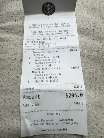 喺香港呢个繁忙嘅都市入面,揾一个可以静静地享受一杯好咖啡同埋一餐美味嘅地方并唔容易。但系,喺中环嘅毕打街,我发现咗一个隐世嘅宝藏 - Trois Cafe。首先,我要讲嘅就系佢哋嘅Flat White。呢杯咖啡真系令人惊艳,口感顺滑,味道浓郁,每一啖都充满咗咖啡嘅香气。佢哋用嘅咖啡豆品质极高,而且冲调技术亦非常出色,令到每一杯咖啡都达到完美嘅平衡。然后,我试咗佢哋嘅Tomato beef cheek & mozerella。呢道菜真系令我大开眼界。牛肉脸颊肉质鲜嫩,配上新鲜嘅番茄同埋香浓嘅mozerella芝士,味道层次丰富,每一口都令人回味无穷。而且,佢哋嘅烹调技巧非常高超,将每一种食材嘅味道都发挥到极致。至于环境方面,Trois Cafe嘅装修风格简约而优雅,营造出一种舒适而放松嘅氛围。无论你系想一个人静静地享受一杯咖啡,定系同朋友一齐分享美食,呢度都系一个理想嘅选择。总括嚟讲,Trois Cafe系一间值得推介嘅餐厅。无论系食物质量、服务态度,定系环境布置,都表现出咗佢哋对细节嘅关注同追求。如果你喺中环区揾紧一个可以放松身心、享受美食嘅地方,咁Trois Cafe绝对系你嘅不二之选。…查看更多