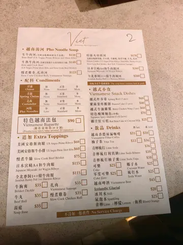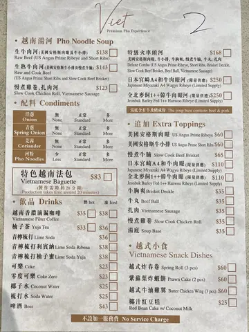 赞-汤底系相当出色 够香够浓 牛肉质感相当好 够柔软 够肉味 虾饼好足料 咬到好多完整既虾 越南咖啡好好饮 够味而唔过苦-服务好好 笑容够 服务好爽手弹-河粉份量细份左啲-价钱的确唔平