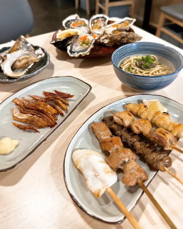 試左燒鳥七里香串、燒鳥雞心串、燒鳥大腿串、燒豬頸肉串同燒墨魚仔串五款串燒,同燒味醂魚乾、烤帆立貝。Overall來講餐廳係烤蠔以外嘅食物比較容易overcooked,有啲燒得過熟,令到肉質有啲實同硬。唯一燒豬頸肉串有驚喜,keep到有彈性同 juicy。