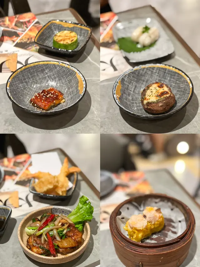 串燒叫左雞軟骨、翠玉瓜、芝士大啡菇 燒得岩岩好 一啲都吾油 炸物食左榴槤炸彈、天婦羅🍤好香脆 炸粉吾厚 另外自助區有得拎點心 有燒賣蝦餃腐皮卷等等 熱辣辣 味道幾有質素!