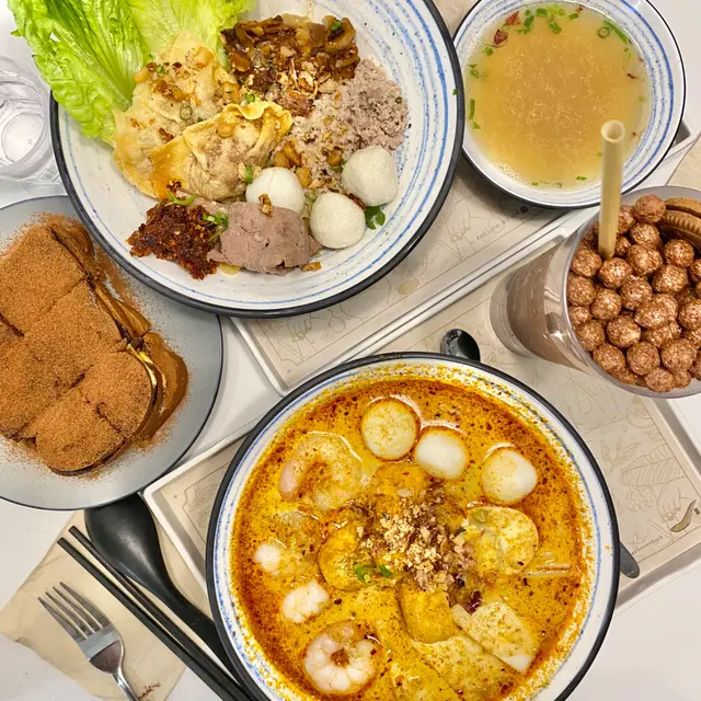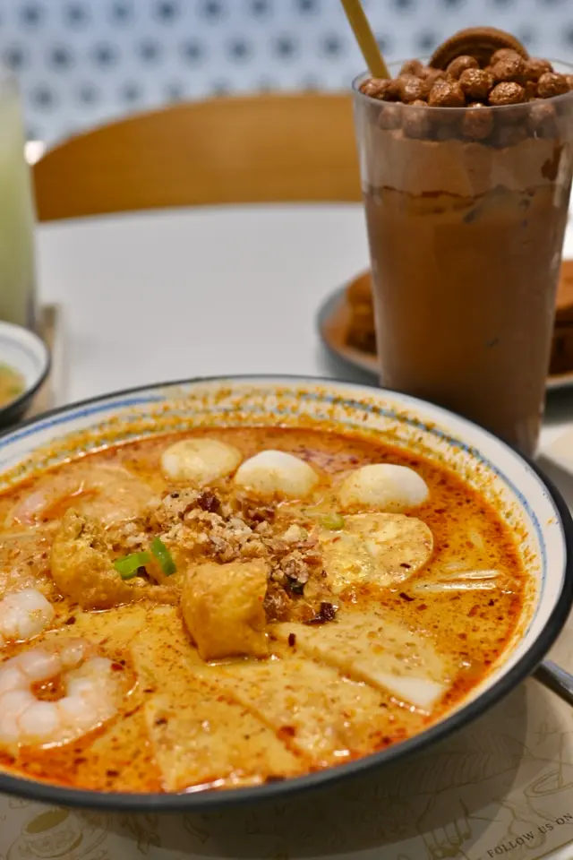 麵底可以揀米粉/油麵/粗米粉,我就揀左粗米粉,其實即係米線。湯底都做得唔錯,有椰香味,而且仲有好多配料,包括蝦,魚蛋,豆卜,蛋 (蝦好爽口彈牙👍🏻)