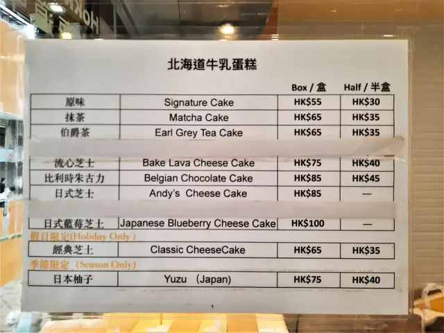 從價目表所見,依家提供9款蛋糕,定價$55至$100。不過有一點仍讓小弟比較在意,價錢牌上明顯刻意寫住「北海道牛乳蛋糕」,當時未有察覺,所以無深究過去問問,喺咪所有蛋糕都用上北海道牛乳整,暫不得而知。