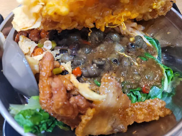 配料有秘製炒螺醬、炸花生、香辣酸筍、酸豆角、木耳絲、炸回鍋肉、爆炒田螺。