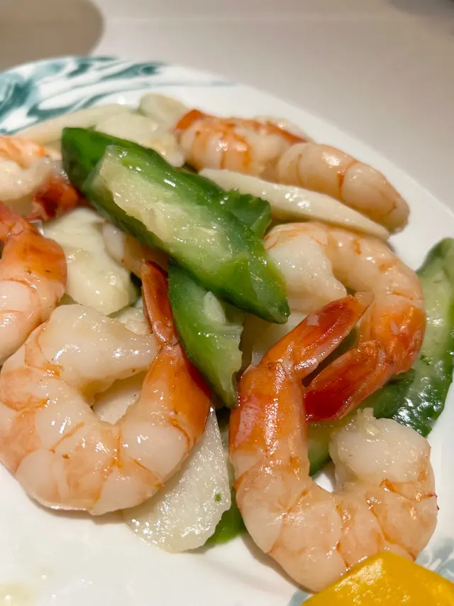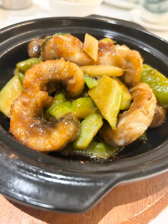 三款清鮮爽脆的食材,包括具補脾養胃嘅鐵棍淮山、勝瓜及鳳尾蝦嘅滋味清炒,清熱解毒,口感一流!