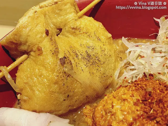 它的靈感來自關東煮,餡料有蔥、粉絲及薑,為這個重口味拉麵稍稍帶來消滯的效果。腐皮袋的表面也被烤過,吃起來有微微的炭香味,十分惹味!