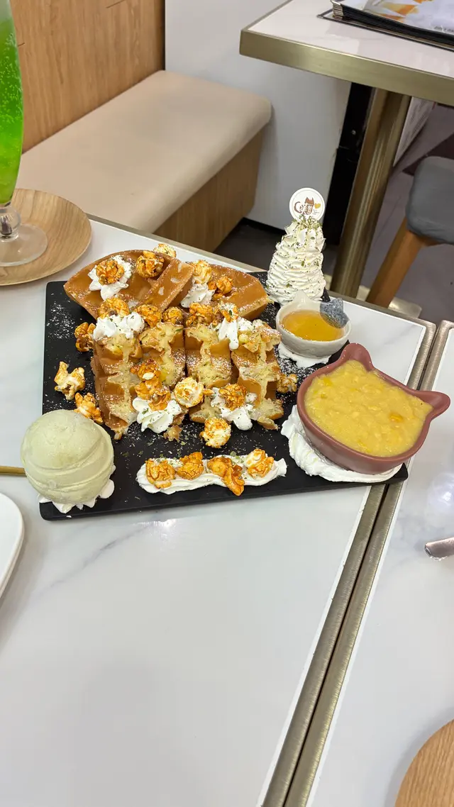 一上枱,聞到好香濃嘅粟米味。個賣相又幾得喎,金黃色嘅粟米湯淋喺剛烘起嘅窩夫上面。切開嗰下最驚喜,中間夾住層麻糬,拉絲效果一流!