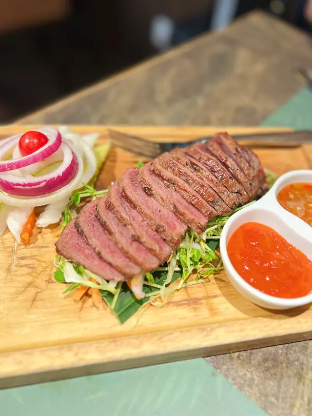 Medium rare火候完美!外層微焦香口,內裡粉嫩軟嫩,牛脂香濃唔韌。蘸少少青辣椒醬更醒胃。旁邊嘅沙律菜清新解膩,細節用心。