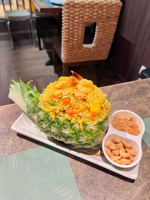 用原個菠蘿上桌,視覺先加分!炒飯乾身唔油膩,蝦仁、魷魚、肉鬆、腰果料多過飯,每啖都食到菠蘿果肉嘅清甜同咖喱香氣。最驚喜係加入提子乾,微甜平衡鹹香,口感大滿足!