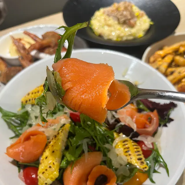 「煙三文魚·柚子玉米沙律柚子醋油」 三文魚都俾得幾大方,卷成花花形狀,柚子、沙律菜都好新鮮,唔會有苦味,玉米反而用咗斜切,仲會輕微灼燒,視覺效果加晒分!🥗🥙