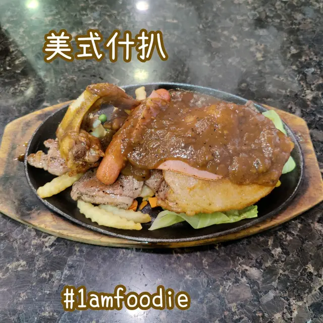 之不過我始終係一個毛都未出齊嘅黃毛小子,嚟到呢啲地方都係食返啲細路仔先食嘅嘢。叫咗個 $62 嘅「美式什扒」配黑椒汁,幾塊薄扒加條腸再加隻雞翼事小,個「喳喳聲」事大,塊板都算熱嘅,啲嘢食就正正常常咁啦。