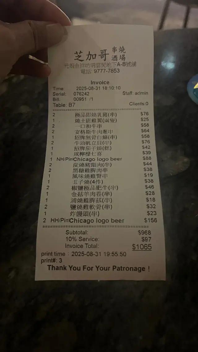 食物加飲品共 $968,加一成服務費 $97,總共 $1065。以串燒酒場嚟講屬中上價位,但食物質素高,服務有禮,侍應落單快又有笑容。