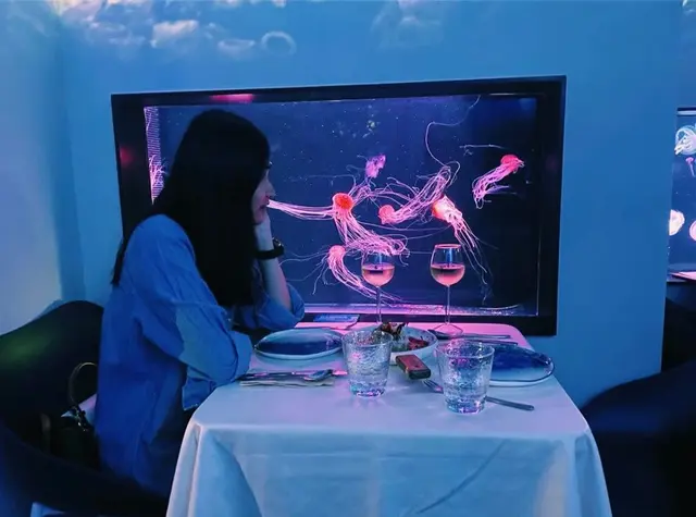 美酒配佳餚,昏暗獨特的環境,優美的水母在旁游動,和那個特別的人相聚,令這個晚上變得不一樣。浪漫,悠然,來了便不願離開。