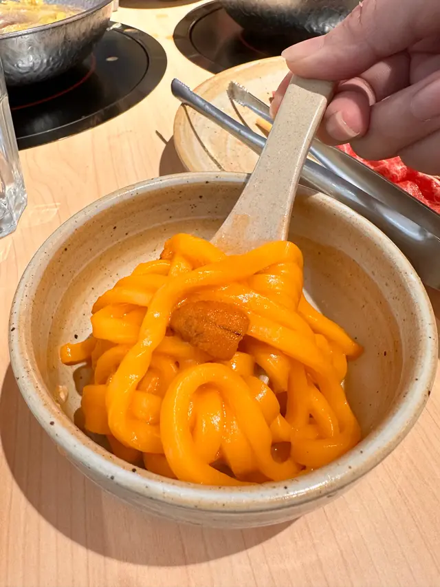 北海道十勝產黑毛和牛霜降肉,油花分布和瘦肉部份比較平均,灼一灼入口質柔軟有肉味,加錢配搭了北海道海膽高湯(+HK$58),湯底裡真的有海膽,不用蘸其他醬汁已經很好味道,推薦加錢配海膽高湯。
