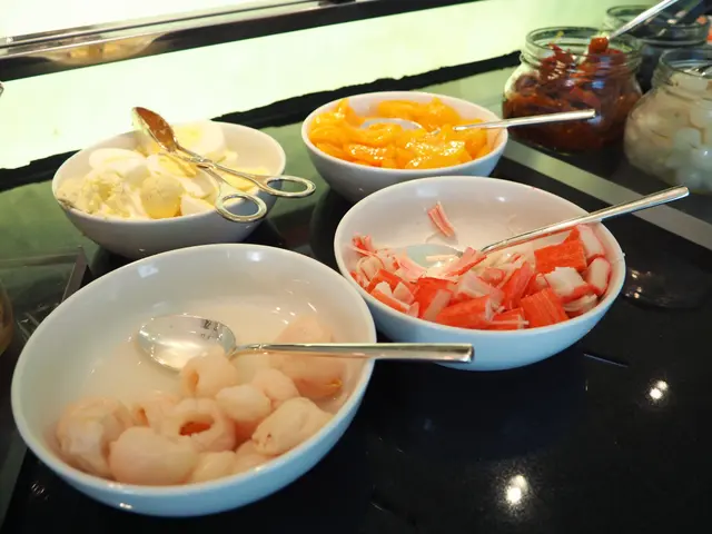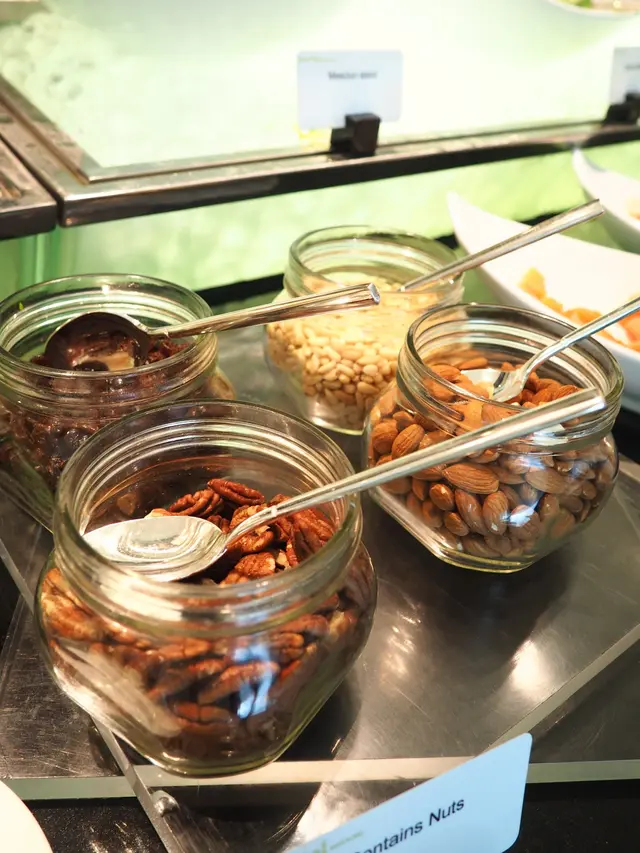 堅果堆 荔枝肉 黃桃片 粟米粒 蕃茄 青瓜 三文魚 自家製果亁等等