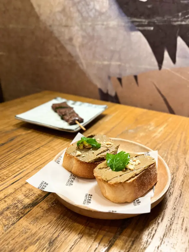 法包烤至香脆, 上面塗上雞肝醬, 味道微甘香, 口感柔滑, 表面再撒上花生碎🥜, 非常香口!