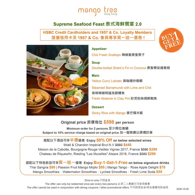 有興趣可以去佢官網睇menu👀 我都係訂枱問問下先知,睇番係匯豐信用卡或者1957 & Co.會員都做到買一送一,加一跟原價