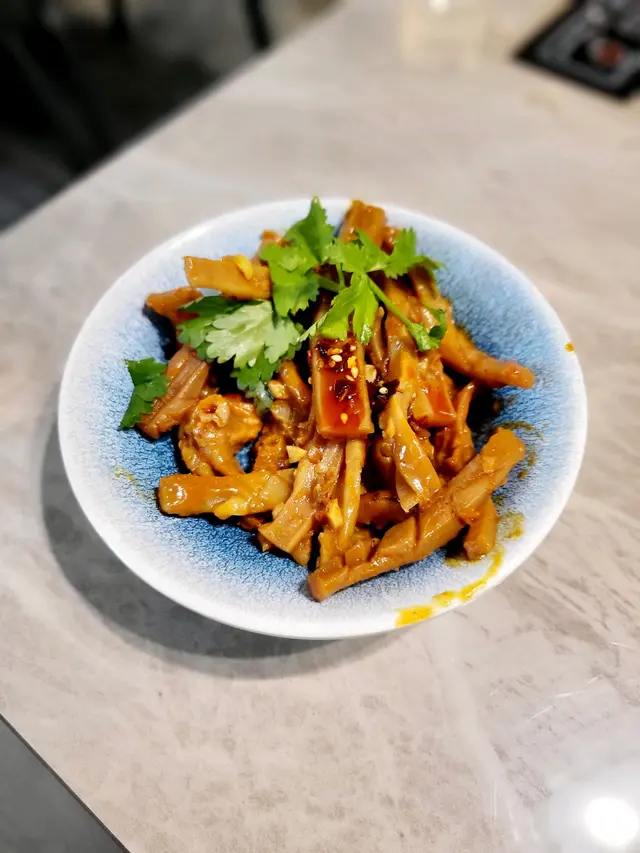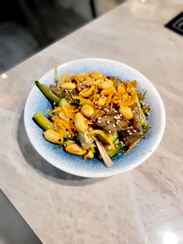 炸魚皮入口微脆,味道辛辣,搭配花生及青瓜絲,中和辣度同時增加口感。