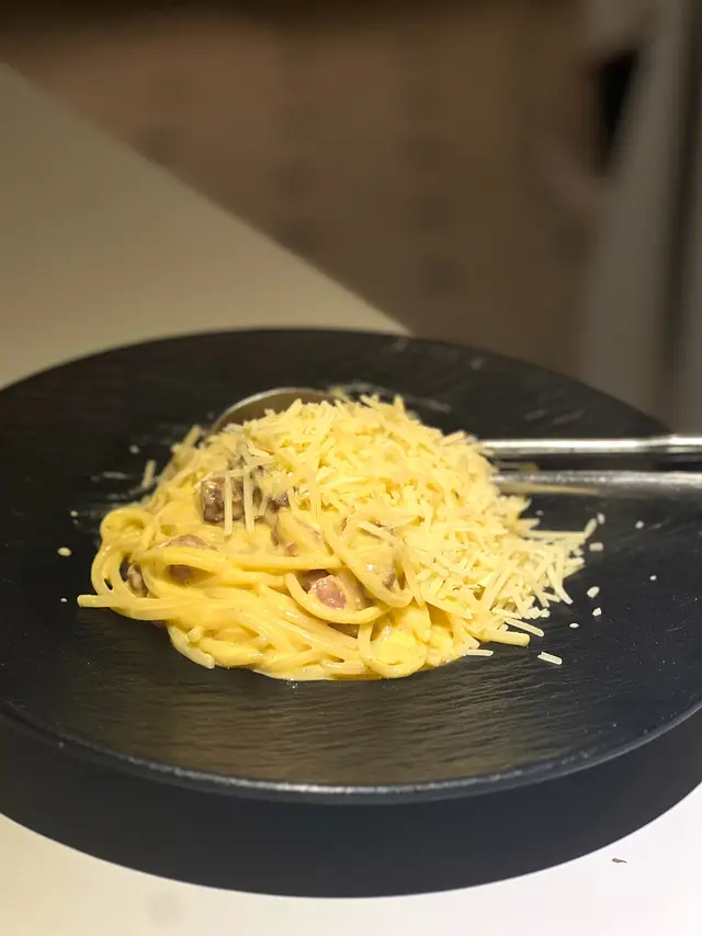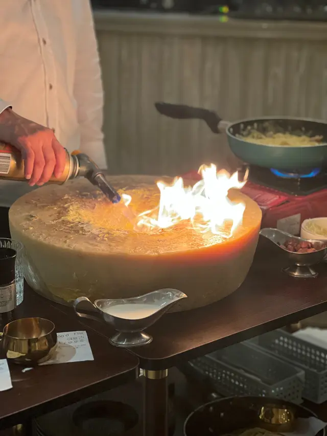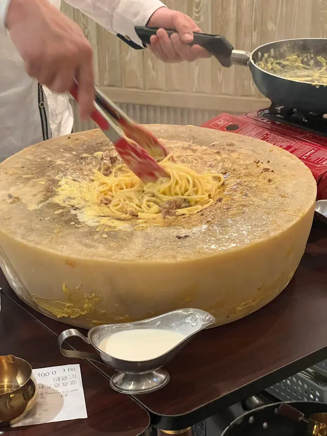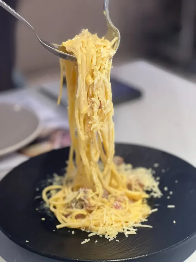 呢個直頭係一個表演,喺你餐桌旁直接煮,勁新鮮嘅卡邦尼,每一條都掛晒汁同芝士。大家記得打卡還打卡,呢個要趁熱食先最好!