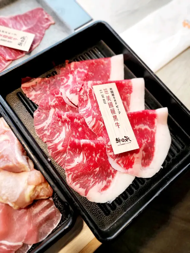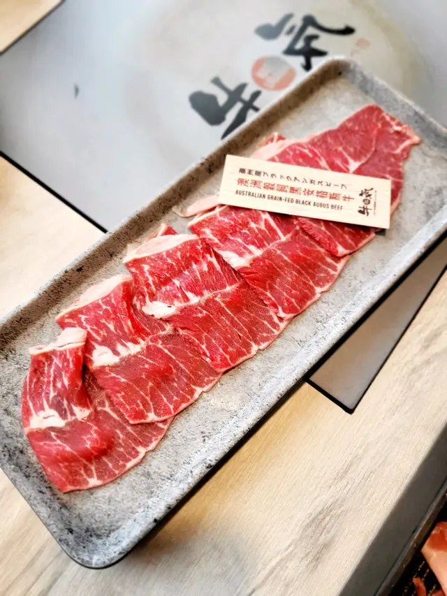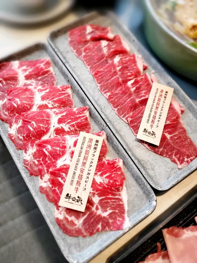 澳洲穀飼黑安格斯牛牛肉大大片,肉質淋滑,油花不重,肉味濃厚;美國極黑牛有細緻油花紋理,入口甘香帶油花;Prime 美國肩胛肉眼肉質鮮嫩,油脂分布均勻,口感極佳。