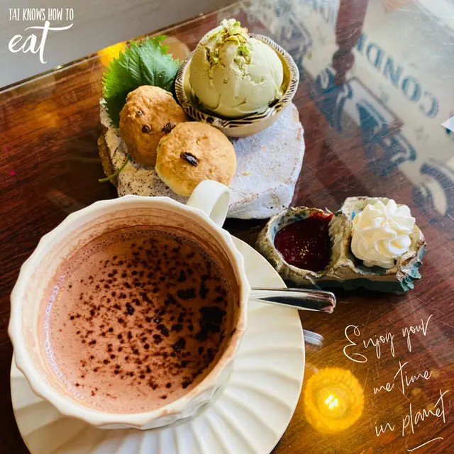 到了餐牌,手繪餐牌,會寫埋介紹比你知selling point 係咩,應該欣賞什麼,點了熱特濃朱古力,正常發揮,欣賞杯和碟,充滿hand made 感覺,有瓷器拉杯感覺,加了一個鬆餅配是日精選雪糕,今日係開心果,D碟真係好靚,有啲似隕石碎片咁,有隻細瓷碟,是配合到開心果雪糕那種綠,我欣賞這種好art piece既執著,有時一套特色嘅碗碟係會為食物加分,開心果雪糕係全餐驚喜之作,唔會太甜,有開心果肉,加了少許熱浪薯片作點綴,視覺及味覺上也有衝擊,好食。鬆餅外脆內軟,配合雲呢拿子奶油或果醬,唔錯。