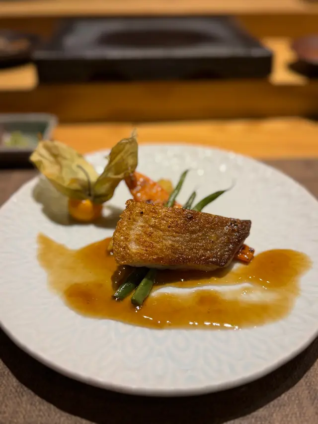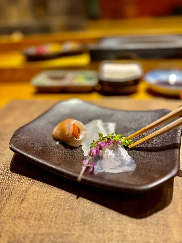 套餐以刺身作為優雅的開場。左口魚薄切配馬糞海胆是視覺與味覺的雙重藝術——透薄的左口魚肉質爽脆,清雅淡甜,與頂級馬糞海胆那濃郁甘醇、入口即化的澎湃鮮味形成絕妙對比。而春魚則以其鮮明的銀身魚風味,帶著微妙的油脂與恰到好處的酸桔點綴,展現了時令的獨有魅力。