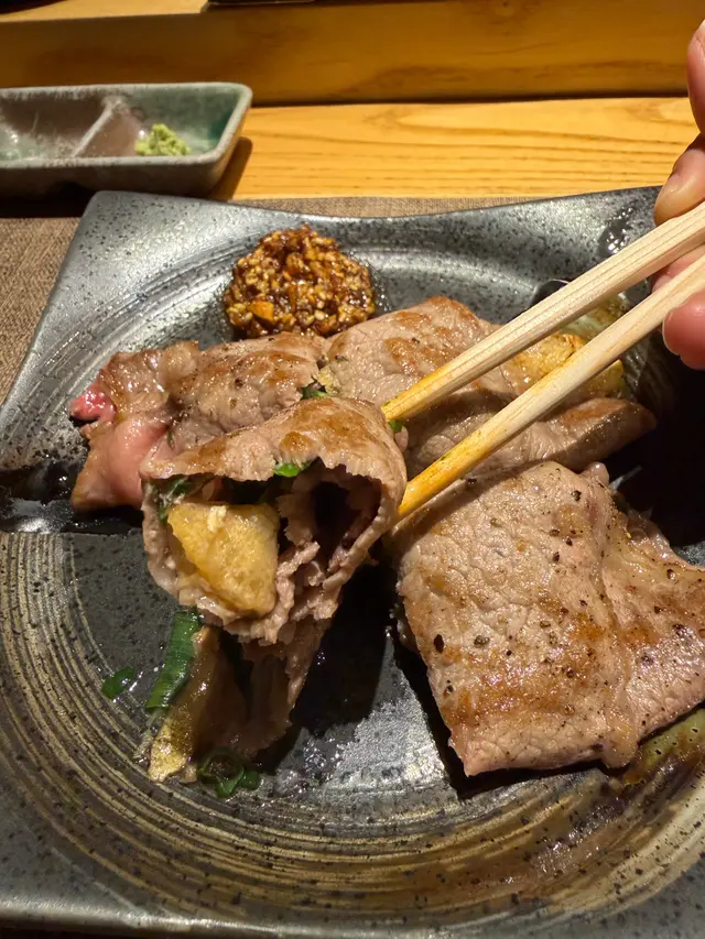 美國特級牛肉薄燒、薄切的牛肉在鐵板上快速捲起,包裹著香蔥、蒜片,肉香、油香與辛香在口中交織,滋味豐富。