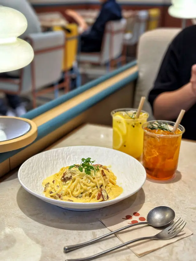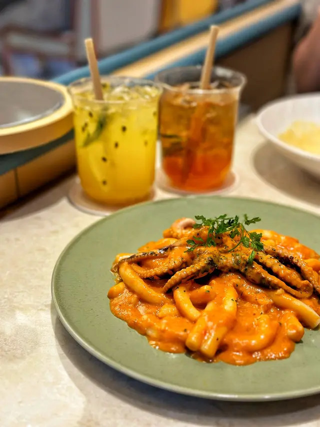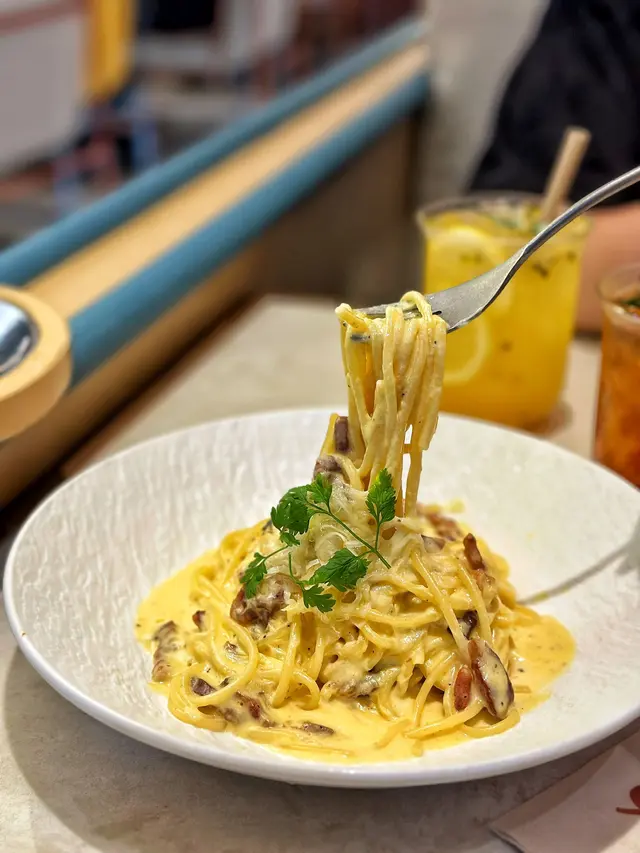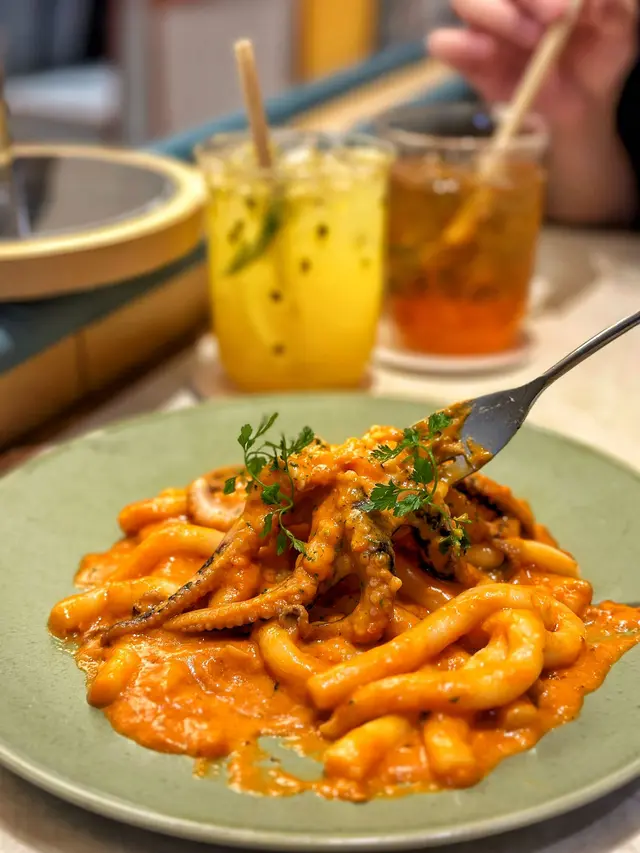 玫瑰醬八爪魚年糕,雖然佢叫玫瑰醬,不過唔係用玫瑰整成,而係佢個醬名同玫瑰發音有啲似,咪道咸咸地辣少少微辣,但唔似大醬果種味咁濃厚,年糕煙煙韌韌好好味啊😳🫶見到有兩款卡邦尼意粉,最後咪叫咗貴嗰款🤭