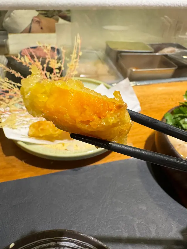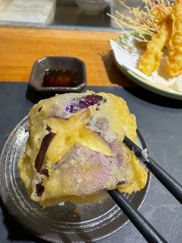 什錦天婦羅有炸蝦3隻、南瓜、茄子、青椒和蕃薯