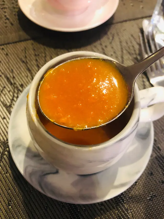 餐湯係南瓜蓉湯,顏色飽滿亮麗,味道柔滑香甜嘅,每一啖有少少南瓜蓉,暖到入心~