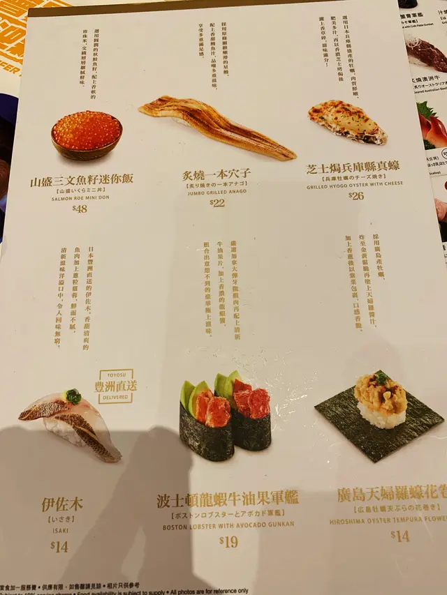例如山盛三文魚籽迷你飯、炙燒一本穴子、芝士焗兵庫縣真蠔、伊佐木、波士頓龍蝦牛油果軍艦及廣島天婦羅蠔花六款美食