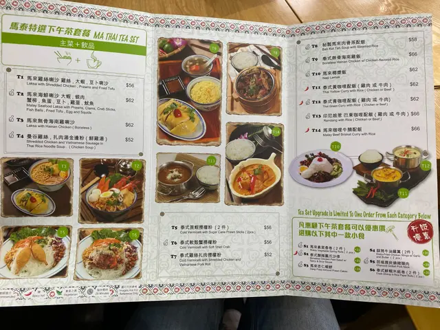 由於星期日訓飽飽先出門口,我地兩點半先入座,已經去到下午茶時段。下午茶餐選擇非常豐富,有喇沙湯粉、泰式撈檬、肉骨茶、海南雞飯及咖哩飯等等,加廿幾蚊仲可以加埋蝦餅同春卷等小食!