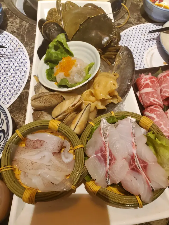 火鍋海鮮種類都多,特別蟹又大隻又多膏 蟹鉗有我手掌咁大 鮑魚仲喐下喐下,蜆咩都算大隻冇沙、 魷魚好鮮甜 最愛嘅蝦滑食咗三碟😋 花膠都唔算迷你、對於我嚟講青口 就麻麻,原條小桂花魚好鮮甜, 餃子皮薄好正到到尾聲仲有芝士蛋糕,雖然已經很飽 但都食曬 整體食物好有誠意嘅 上次飲品下次調味料 都感覺有個心去做的 好滿意 一定會再encore