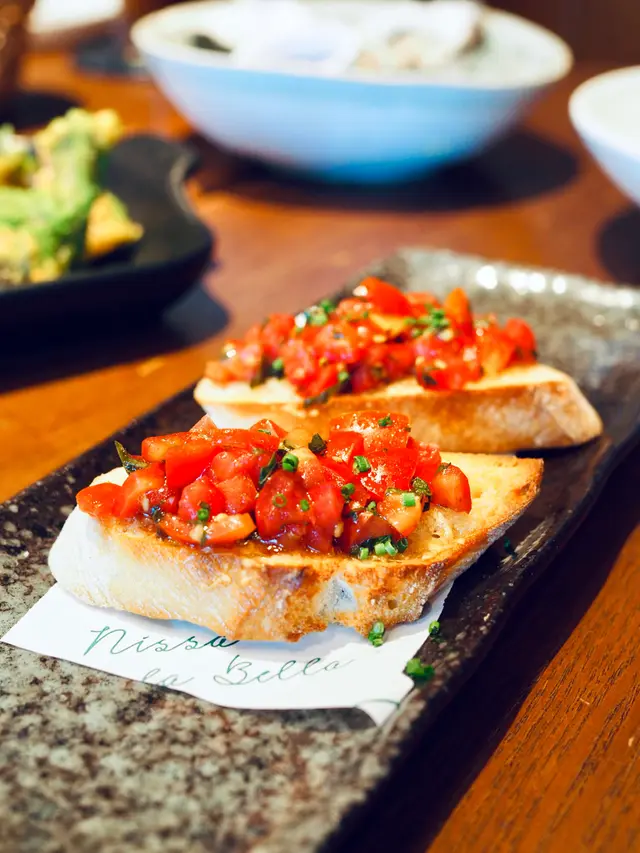 以橄欖油醋汁調味的烤麵包上舖滿蕃茄粒、羅勒和芝士碎,充滿清新的酸甜味道。