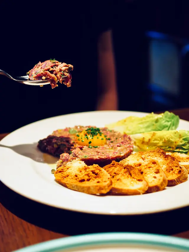 生牛肉他他擺盤精緻,與蛋黃拌勻口感更順滑,再塗抹在烤麵包上,軟滑與香脆的口感交織出美妙滋味。