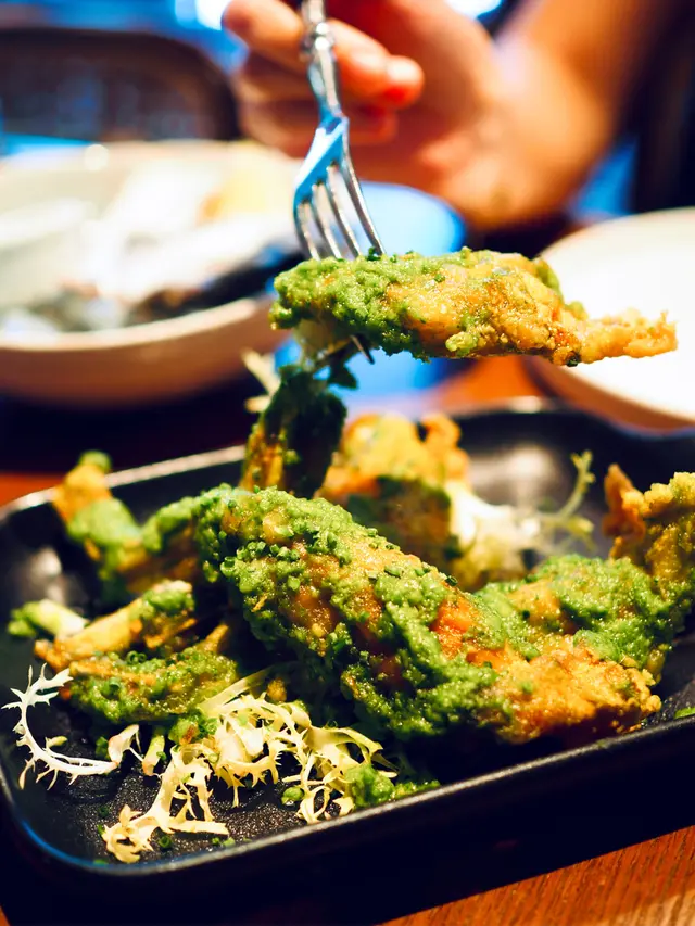田雞腿肉質鮮嫰,口感與雞肉相似。外皮炸至酥脆,再塗上一層以番茜及蒜香牛油製成的青醬,惹味可口卻沒有半點油膩。